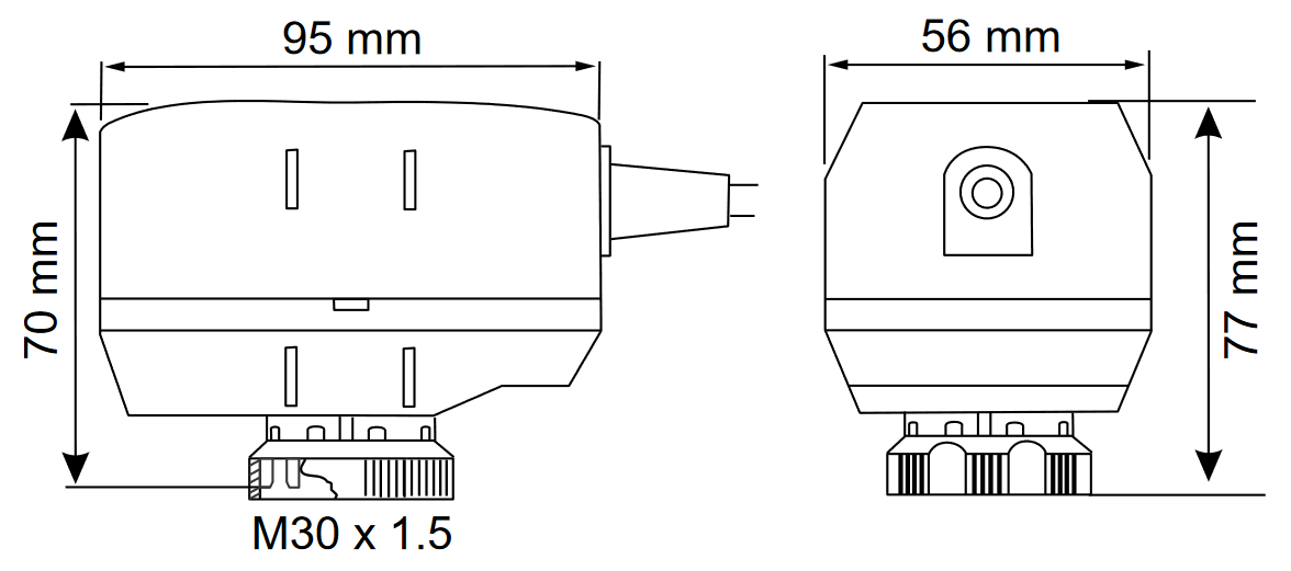 Il servomotore dispone di una forza di controllo di 100 N e la sua corsa massima è limitata dalla sede della valvola. In entrambe le posizioni finali, il motore non consuma energia. È alimentato da un cavo integrato di 0,8 m di lunghezza.