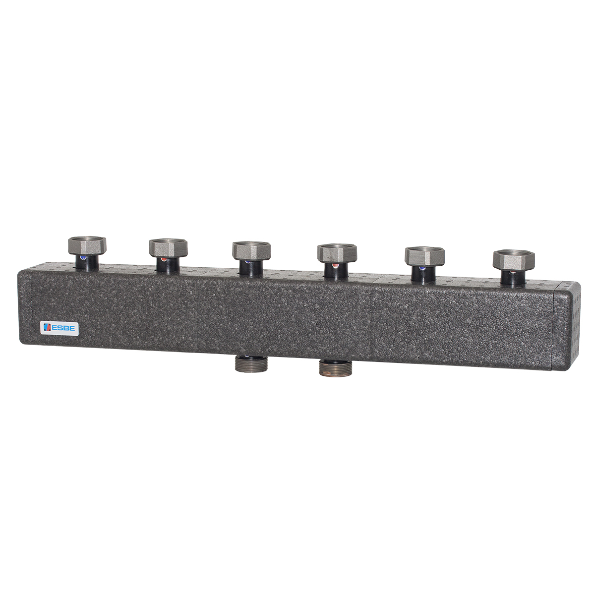 Collettore per gruppi di pompaggio con dimensione di connessione DN 25-32 serie GxA100. È fornito in una custodia isolante e con staffe per il montaggio a parete. Il collettore è contrassegnato con colori per rendere l'installazione il più semplice possibile.
