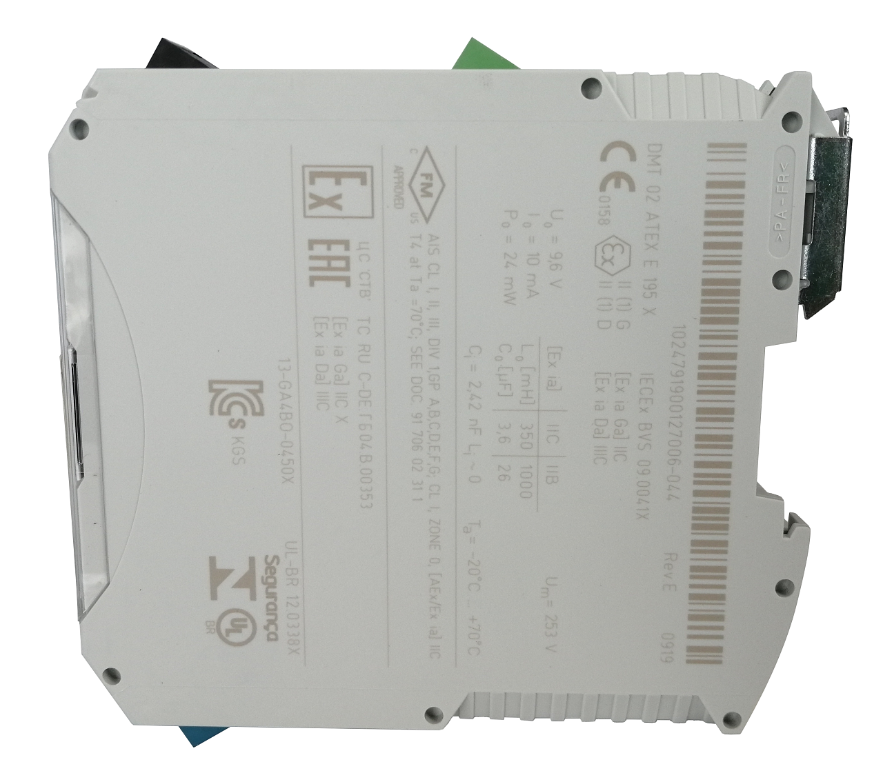 Amplificatore di commutazione con circuito a sicurezza intrinseca per termostati, termostati antigelo, interruttori di pressione, contatti, protezioni filtro, segnali on-off. Consente il collegamento sicuro dei dispositivi nel circuito anche in aree esplosive delle zone ATEX 0, 1, 2, 20, 21, 22.