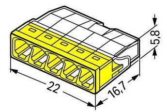 Morsetto di giunzione per scatola COMPACT per conduttori pieni con diametro massimo di 2,5 mm². Con cinque punti di connessione.