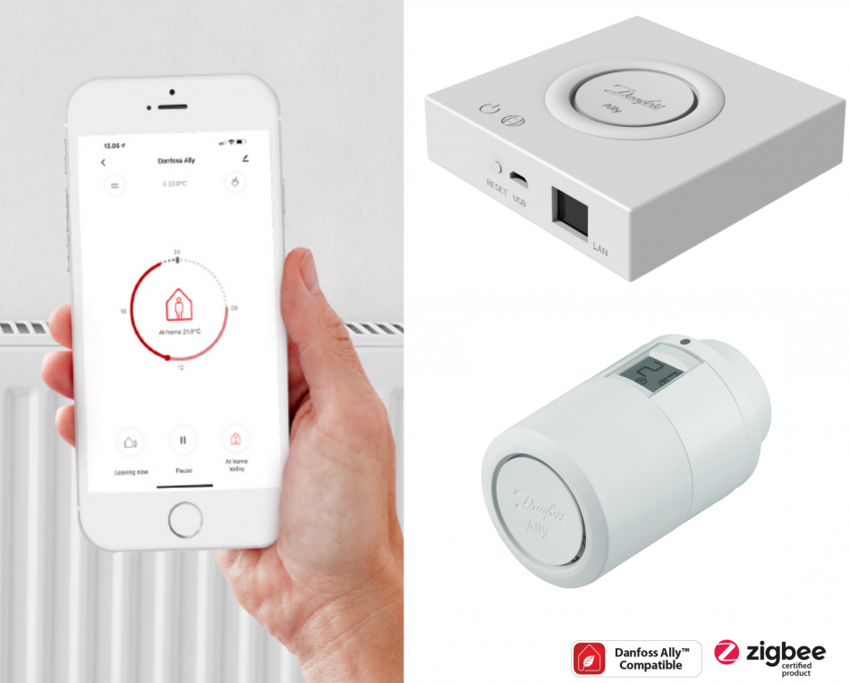 Il kit iniziale per il riscaldamento intelligente include l'unità centrale Danfoss Ally Gateway e la testina elettronica wireless Danfoss Ally. Il sistema è adatto sia per il riscaldamento a radiatori che per quello a pavimento nelle abitazioni.