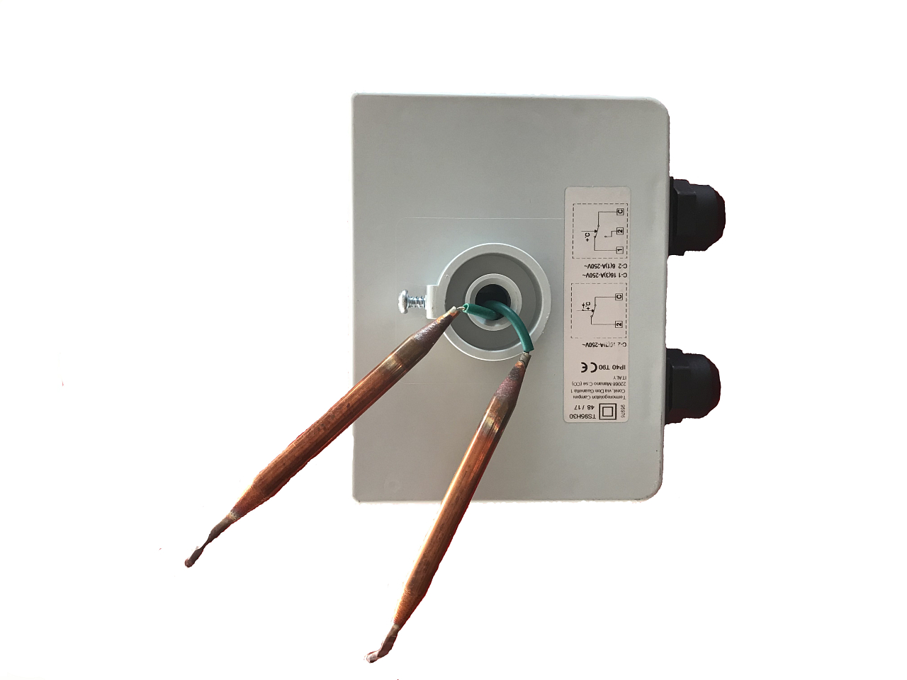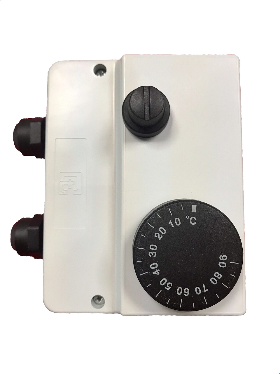 Termostato a pozzetto con manopola di regolazione. Doppia esecuzione, con una parte fissata a 100 °C e l'altra regolabile nell'intervallo 0-90 °C