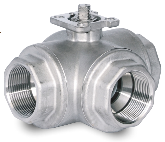 Valvola a sfera a tre vie VL321L con foro a sfera tipo T, PN63, DN 50, PTFE, max 190°C. Maggiori informazioni
